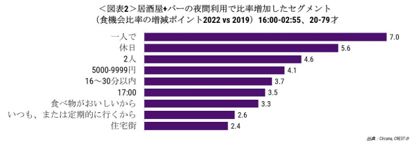 居酒屋・バーで客数比率が増加したセグメントをみると(図表2)、一人での利用が7.0ポイント増と最も比率増加しました。休日、2人、16-30分以内、17時台の利用、住宅街の利用比率が増加しており、コロナ禍の影響で利用シーンが少人数、短時間、自宅の近くに変化したことが分かります。一人当たりの客単価が5000-9999円で増えていることから、高価格帯が増加していることが分かります。店舗選択理由は、立地や価格の安さでの理由が減少し、食べ物のおいしさ、いつも行くから、といった理由が増加しています。