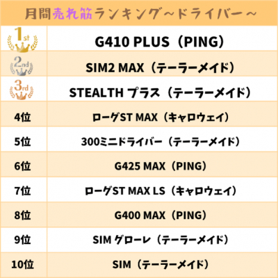 1位は寛容性と飛距離のバランスに多くの支持を集めているG410 PLUS(PING)、次いで2位が2021年販売にも関わらず、今なお人気なSIM2 MAX(テーラーメイド)がランクイン。そしてハードヒッターに非常に人気の高いSTEALTHプラス(テーラーメイド)が堂々3位に入る結果でした。