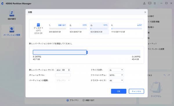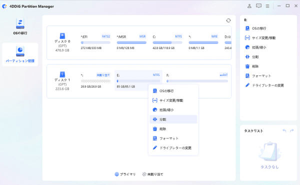 ディスク管理は、コンピューターにあまり習熟していない人にとっては確かに難しいかもしれません。 うっかりミスをして、ディスクが破損したり悪化したりする可能性もあります。しかし、「4DDiG Partition Manager」というパーティション管理ソフトの「パーティーションを分割」機能を利用すると、パソコン初心者でも、自力でパーティションを安全かつ高速に分割できます。