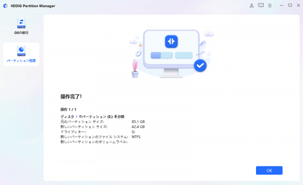 手順4.分割プロセスには時間がかかる場合がありますので、プロセスが完了するまでプログラムを閉じずにしばらくお待ちください。パーティションが2つの小さなパーティションに正常に分割されたら、「OK」をクリックします。