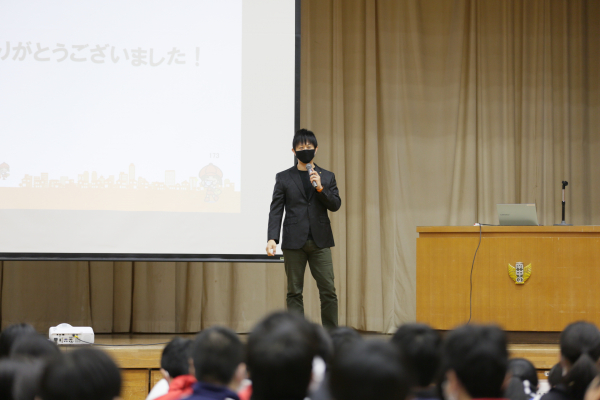 講演では、前半は当社の事業説明と、佐藤自身の学生時代の考え方や元自衛官ならではの普段は聞けない自衛隊の訓練の様子などを伝えるとともに、後半では事前にアンケートで学生たちから質問のあった『社会に出た時に大切なことは?』、『働くために中学生の時に身につけておくことは?』などに答えていく形で、働くことはなぜ楽しいのか、今の自分と向き合う大切さを伝えました。