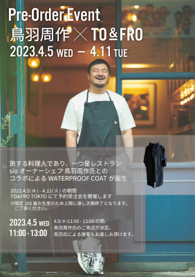 創業89年の合繊メーカー「カジグループ」のカジレーネ株式会社(石川県かほく市・代表取締役 梶政隆)が運営する、同社の生地を使用し「気持ちまで軽くなる軽さ」をコンセプトにしたファクトリーブランド「TO&FRO(トゥーアンドフロー)」(https://toandfro.shop)は、一つ星レストラン『sio』のオーナーシェフ 鳥羽周作氏とのコラボレーションにより『鳥羽周作×TO&FRO WATERPROOF COAT』を製作しました。2023年4月5日(水)~4月11日(火)の期間、東京ミッドタウン八重洲2Fの『TO&FRO TOKYO』にて予約受注イベントを開催します。4月5日(水)の11:00~13:00の間は、鳥羽氏による接客もお楽しみいただけます。