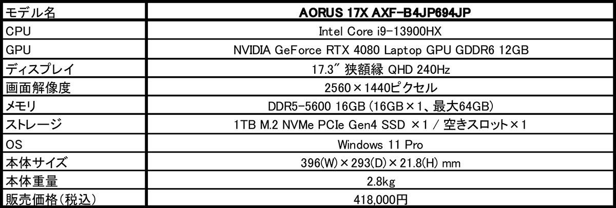 2023年3月28日 - GIGABYTE Technology Co., Ltd. 台湾・新北市 - コンピュータテクノロジーで世界をリードするGIGABYTE Technologyは、第13世代Intel Core i9プロセッサとNVIDIA GeForce RTX 4080 Laptop GPUを搭載し、ディスプレイにリフレッシュレート240Hzの17.3型QHDパネルを採用した高性能ゲーミングノートPC/モバイルワークステーション「AORUS 17X AXF-B4JP694JP」をパソコンSHOP ARKを通して3月29日より販売を開始いたします。販売価格(税込)は、418,000円です。