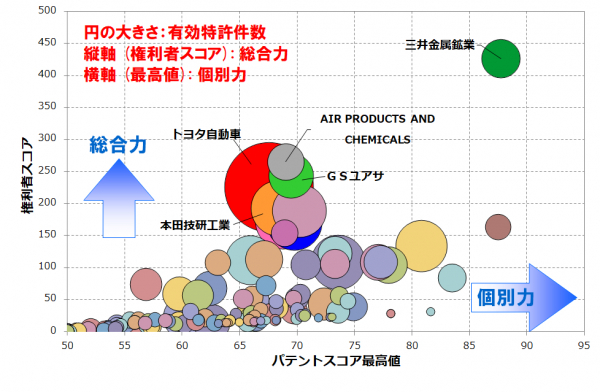 脱炭素社会の実現のためには経済社会システム全体の変革(GX:グリーントランスフォーメーション)が必要とされており、GXへの積極的な取り組みが求められています。本ランキングでは、GX技術区分の1つであり、1993年から2023年3月17日までに日本の特許庁で公開された「水素の貯蔵・輸送・供給・水素ステーション関連技術」全般について、個別特許の注目度を得点化する「パテントスコア」をベースに、特許の質と量から総合的に見た評価を行いました。