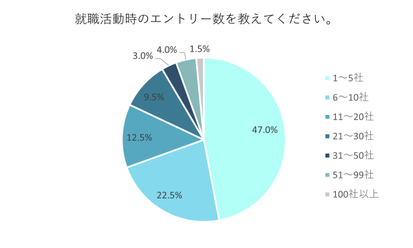 就職活動時のエントリー数をたずねたところ、最も多かった回答が「1~5社」で47%、次いで「6~10社」22.5%となり、約7割が志望度の高い企業に絞って就活を進めていることがわかりました。また、今回意外だったのは、業界も職種も絞らずに応募した人が29.5%もいたことです。様々な可能性を試す意味では有効な手段と言えるでしょう。