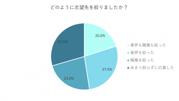 「業界も職種も絞った」20%、「業界を絞った」27.5%、「職種を絞った」23%、「あまり絞らずに応募した」29.5%でした。