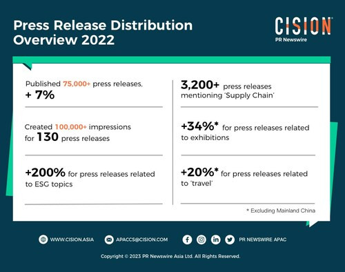 香港、2023年3月28日 /PRNewswire/ -- Cisionの子会社で、ニュース配信とアーンドメディアのソフトウェアとサービスの世界的な大手プロバイダーであるPR Newswireは本日、厳しい世界環境にもかかわらず、アジア太平洋地域の企業が情報発信キャンペーンに継続的に積極的だったと発表しました。PR Newswireの最新データによると、過去1年間に配信されたプレスリリースは75,000本を超え、2021年から7%増加しました。環境・社会・ガバナンス(ESG)関連のプレスリリースは2倍以上に急増し、フィンテック分野のプレスリリースは250%以上に急増しました。さらに、もう1つの人気テーマである環境技術に関するプレスリリースは、過去1年間で40%増加しました。サプライチェーン、環境技術、サステナビリティ、Web3、および第4四半期の世界的な旅行・観光業の回復といった主要テーマを含むプレスリリースが、注目のテーマとして浮上しました。