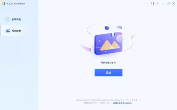 Step2:ホーム画面で「写真修復」メニューを選び、「追加」ボタンをクリックします。