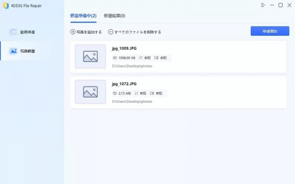 万が一鮮明にした画像が破損して、開けなくなってしまった場合には、画像の修復専門ツールである4DDiG写真修復を利用するのがおすすめです。4DDiG写真修復は、さまざまな形式の写真を、たった数ステップで簡単に修復できるソフトで、専門的な知識がない方でも簡単に利用できる分かりやすいインターフェースが特長です。なお、4DDiG写真修復は、開けなくなった画像だけではなく、例えば色の乱れや欠損が発生している画像なども、同様に修復できる強力なソフトです。