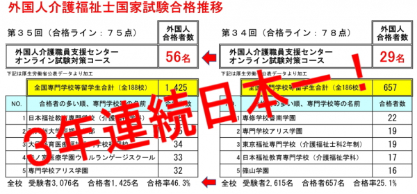 同日に厚生労働省が公開した全国介護福祉士養成施設(2年以上の通学制専門学校等)の結果発表において、外国人留学生合格者の最も多かった日本福祉教育専門学校の38名を大幅に上回り、介護福祉士養成施設と単純比較した外国人合格者数では3年連続日本一を達成しました。