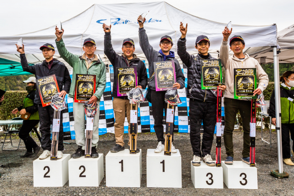 途中検量後の後半戦はさすがにやや食い渋ったものの、浅ダナセットの岡田健司選手&チョーチンセットの小寺則之ペアが最後まで粘り強く釣り続け、計30.6kgを釣り上げ、ラストの雨もものともせずに、見事に初優勝を決めた。