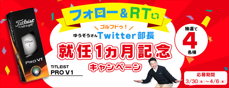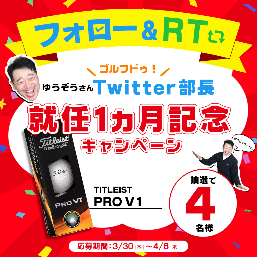 株式会社ゴルフ・ドゥ(本社 さいたま市 代表取締役社長:佐久間功)の運営する公式Twitter「【公式】ゴルフドゥ!(以下、当社公式Twitter)」にて、タイトリスト プロV1 ボールを抽選で4名様にプレゼントする「ゆうぞうさんTwitter部長就任1ヶ月キャンペーン」を実施中です。応募期間は2023年3月30日(木)から2023年4月6日(木)です。