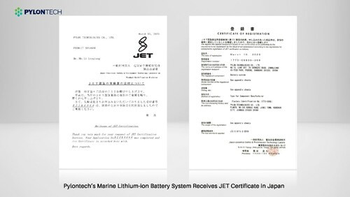 上海、2023年3月30日 /PRNewswire/ -- 2023年3月10日、Pylon Technologies Co., Ltd.(以下「Pylontech」)(ストックNo.:688063)は、同社の船舶用リチウムイオン電池システムが日本でJET認証を取得したと発表した。JIS C 8715-2:2019試験規格にに基づいて発行されたこの認証は、37Ah単セル(型式PF37M)のJET認証、Force H2電力貯蔵システムのSマーク取得に続き、日本市場でPylontechが認められたもう一つ証となった。