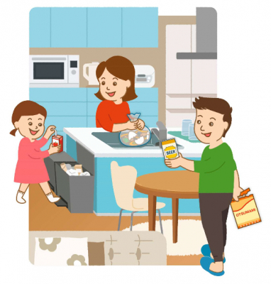 (2)対面タイプキッチンでは、リサイクルゴミもキッチン空間で保管
