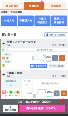 レース配下オッズ・購入ページの「買い目選択」「金額設定」画面で買い目を作成後、[買い目を送信]ボタンを押下していただきます。