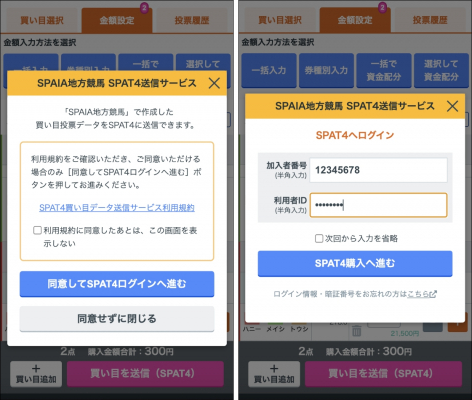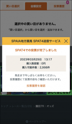 投票データは SPAIA地方競馬オッズ・購入ページの「投票履歴」に保存されます。