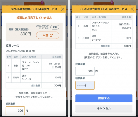 投票データ確認後、「投票金額」と「暗証番号」を各フォームに入力し、[投票する]ボタンを押下していただきます。