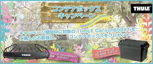 キャンペーン期間(2023年4月20日~5月31日まで)に、THULE Canyon859XT(品番:TH859XT)をご購入頂いたエンドユーザー様に、トランクカーゴTC-50Sブラックをプレゼントいたします。