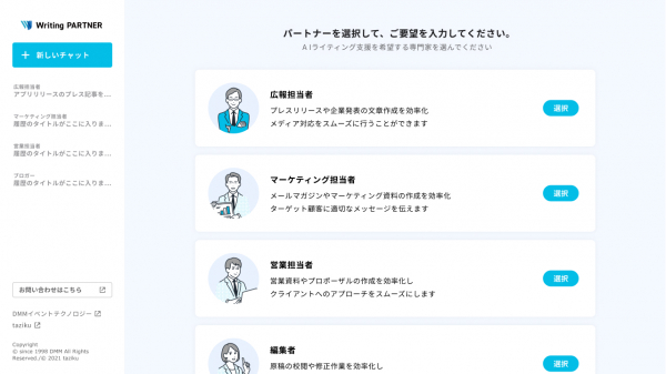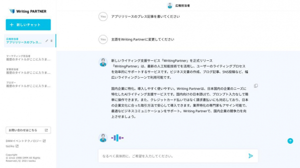 株式会社taziku(本社:東京都渋谷区、代表取締役社長 田中義弘、以下、taziku)と合同会社DMM.com(本社:東京都港区、会長 兼 CEO 亀山敬司 https://dmm-corp.com/ 以下、DMM)は、企業担当者向けAIライティング支援サービス「Writing Partner(ライティングパートナー)」を共同開発し、サービスの提供を2023年4月4日(火)より開始しました。また、2023年4月5日(水)~7日(金)に東京ビッグサイトでおこなわれる「JapanマーケティングWeek 春」のDMMブース(南展示場3ホール S17-5)にて「Writing Partner」のデモを初公開し、実際の操作画面を体験いただくことができます。