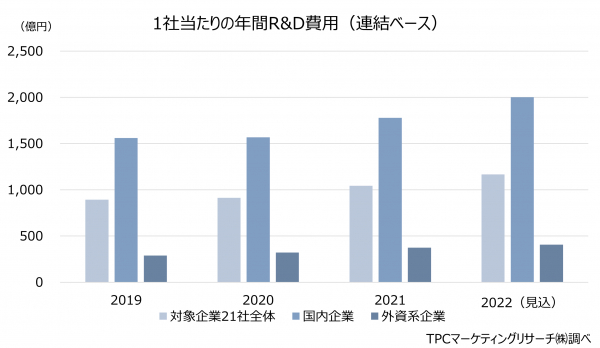 ◆2022年度の平均R&D費は1,166億1,000万円で2021年度から123億4,000万円増加する見通し。国内企業を中心に開発費が増加傾向にある。
