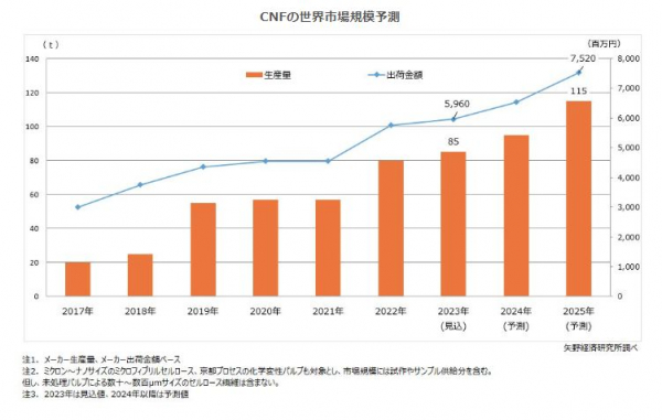 株式会社矢野経済研究所(代表取締役:水越孝)は2023年のセルロースナノファイバー(CNF)世界市場を調査し、市場動向、参入企業動向、将来展望を明らかにした。