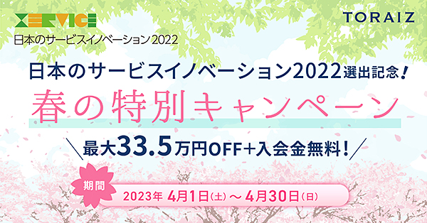 トライオン株式会社(本社:東京都港区、代表取締役社長:三木雄信)が運営する英語コーチング・プログラム「TORAIZ(以下、トライズ)」は2023年3月28日、サービスイノベーションに挑戦している革新的で優れたサービス事例を幅広く選定し公表する、公益財団法人日本生産性本部 サービス産業生産性協議会主催の「日本のサービスイノベーション2022」に選出されました。これを記念して、2023年4月1日から4月30日までにお申し込みの方を対象に、1年間でグローバルビジネスに必要な英語を話す力を身につける「トライズ 英語コーチング本科」を最大39万円割引で受講いただけるキャンペーンを実施します。