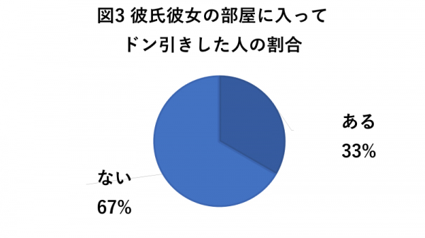 彼氏彼女の部屋に行ったことがある回答者9割のうち、実際に入ってドン引きしたことがあるという方は3割弱。