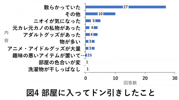 彼氏彼女の部屋に入ってドン引きした方に対し、部屋に入ってドン引きしたその内容について回答を求めました。