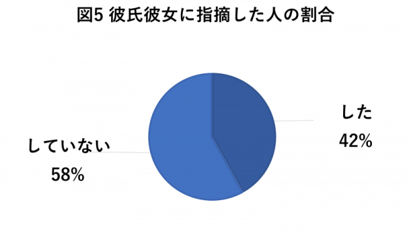彼氏彼女の部屋に入ってドン引きされた方のうち、その旨を伝えた方は42%。伝えていない、あるいは指摘していないという方は58%を占めていました。