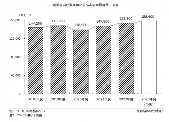 2023年は新型コロナウイルス感染症の5類移行も予定され、コロナ前の生活への回復が期待されること、また業務用化粧品の価格改訂も予定されていることから、2023年度の理美容向け業務用化粧品市場は拡大を予測する。レジャーやファッションをはじめとする多様な娯楽や趣味に生活者の支出が分散化されることに加え、人口減少の構造的問題も重なり、その後、市場は減少に転じるものとみられる。