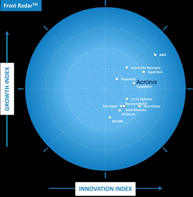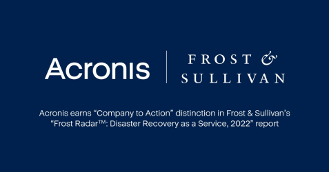 サイバープロテクションのグローバルリーダーであるアクロニスは、このたび、Frost & Sullivanのレポート「Frost Radar(TM): Disaster Recovery as a Service, 2022」にて、「Company to Action」に選出されました。調査対象となった競合は12社で、アクロニスは成長と革新において高い評価を受けたことを意味する象限に位置づけられています。この位置付けは、アクロニスを「投資、パートナーシップ、またはベンチマーキングにおいて最初に検討されるべき」企業として評価するものです。