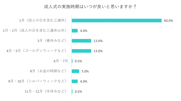 最も多かったのが「1月(成人の日を含む三連休)」で60%でした。次いで「1月・2月(成人の日を含む三連休以外)」4%、「3月(春休みなど)」13%、「4月・5月(ゴールデンウィークなど)」13%、「6月・7月」0.5%、「8月(お盆の時期など)」5%、「9月・10月(シルバーウィークなど)」4%、「11月・12月(冬休みなど)」0.5%となりました。