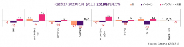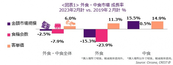 外食・中食市場の2023年2月は、売上2.5%減(2019年同月比)