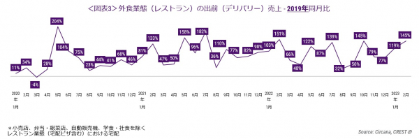 外食業態計(レストラン計)の出前(デリバリー)売上2019年同月比をみると(図表3)、プラス成長が続いています。デリバリー増加のピークは2020年5月の204%増ですが、その後も2ケタ増が続いています。2023年2月は同145%増でしたが、前年同月比では2%減と微減でした。