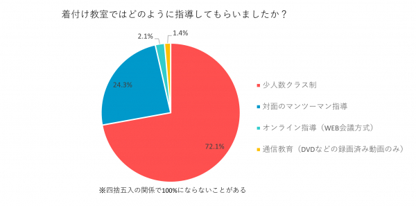 「少人数クラス制」が最も多く72.1%、次いで「対面のマンツーマン指導」24.3%、「オンライン指導(WEB会議方式)」2.1%、「通信教育(DVDなどの録画済み動画のみ)」1.4%という結果でした。