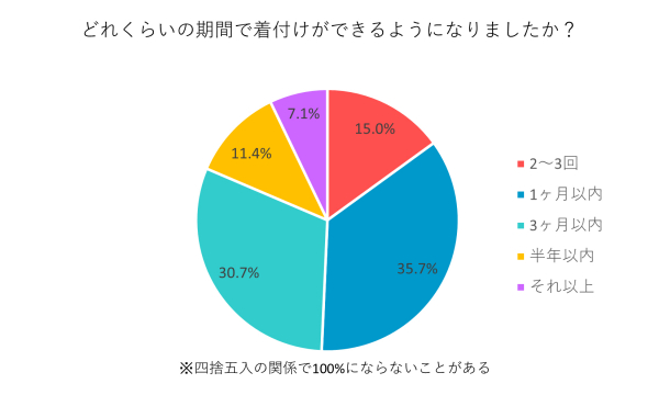今回実施したアンケート調査によると、少人数で受講できる着付け教室を利用していた人は全体の72.1%にのぼることが明らかになりました。また着付け教室に通った場合、3ヶ月程度で着付けをマスターできることもわかりました。