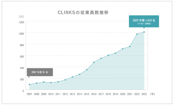 各種アプリ開発やITアウトソーシング事業、IT人材教育研修事業を手掛けるCLINKS株式会社(本社:東京都中央区、代表取締役:河原浩介、以下「CLINKS」)は、2023年4月1日に従業員数1,000名を突破いたしました。