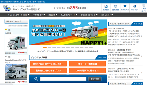 当サイトは、これからキャンピングカーの購入を検討されている方へ向けた日本最大級のキャンピングカーの比較サイトです。国内・海外を含む850台以上のキャンピングカーを、価格や車両サイズ、就寝人数やオプション装備など、約60種類の項目からスペック比較ができ、どのキャンピングカーが人気かを一定期間の閲覧数を基にランキング形式で表示。