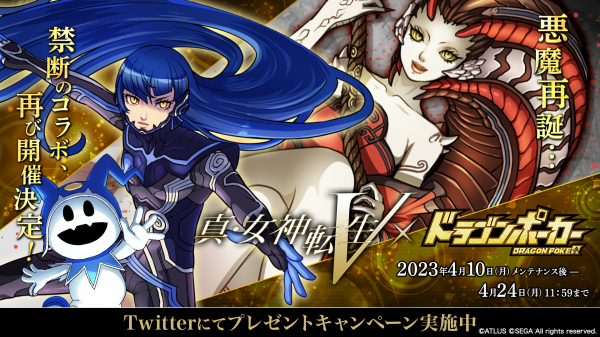 株式会社アソビズム(本社:東京都千代田区、代表取締役:大手智之)は、App Store・Google Playにて好評配信中の『ドラゴンポーカー』と『真・女神転生V』のコラボを記念して、「コラボ開催記念!フォロー&RTで参加!豪華報酬プレゼントキャンペーン」を、2023年4月7日(金)より実施することをお知らせいたします。