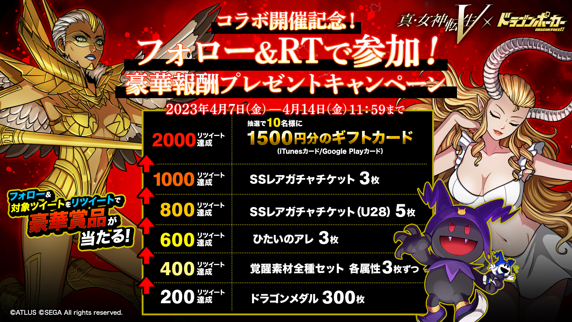 4月7日(金)より、『真・女神転生V』とのコラボを記念して「コラボ開催記念!フォロー&RTで参加!豪華報酬プレゼントキャンペーン」を実施いたします。対象ツイートのRT数に応じて豪華アイテムや、抽選でギフトカードをプレゼント!キャンペーンへのたくさんのご参加お待ちしています!
