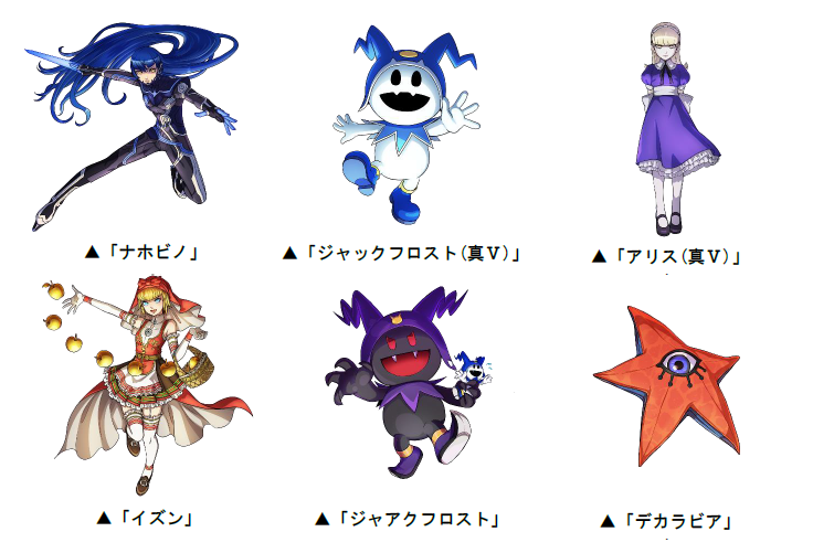前回のコラボで登場した「ナホビノ」「ジャックフロスト(真V)」「アリス(真V)」などに加え、新たに「イズン」「ジャアクフロスト」「デカラビア」をはじめとした人気キャラクター達が描き下ろしイラストで新登場!