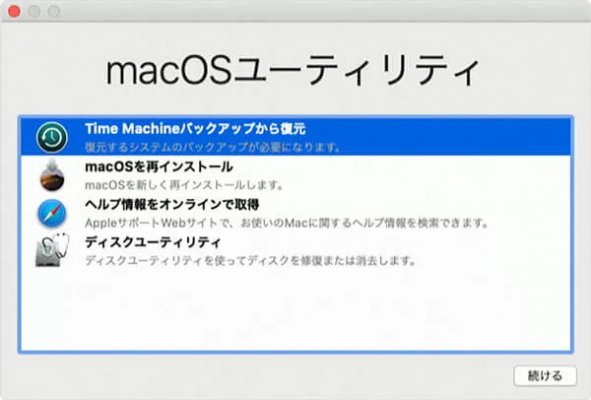(1)Macの電源を入れた直後に「command + R」キーを押して、Time Machineを起動します。