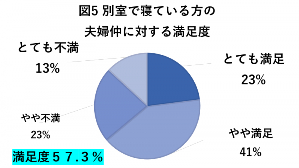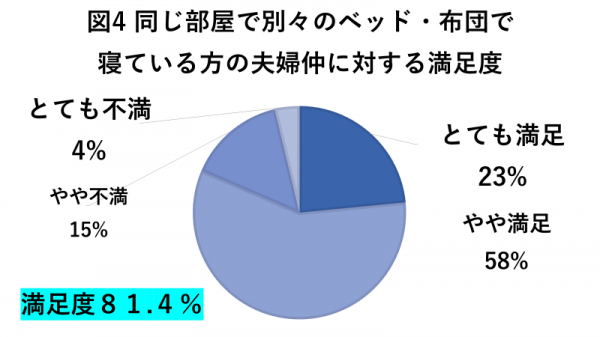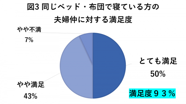 同じベッド・布団で寝ている夫婦の満足度は93%、同じ部屋だが別々のベッド・布団で寝ている夫婦は81.4%、別室で寝ている夫婦は57.3%が夫婦の関係に対して満足感を得ていることが明らかに。