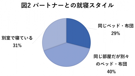 寝る時のパートナーとの就寝スタイルについて回答者に伺ったところ、「同じ部屋だが別々のベッド・布団で寝ている」との回答が最も多くみられました。