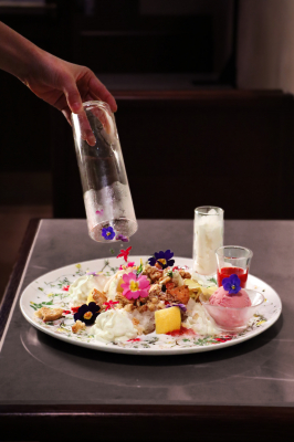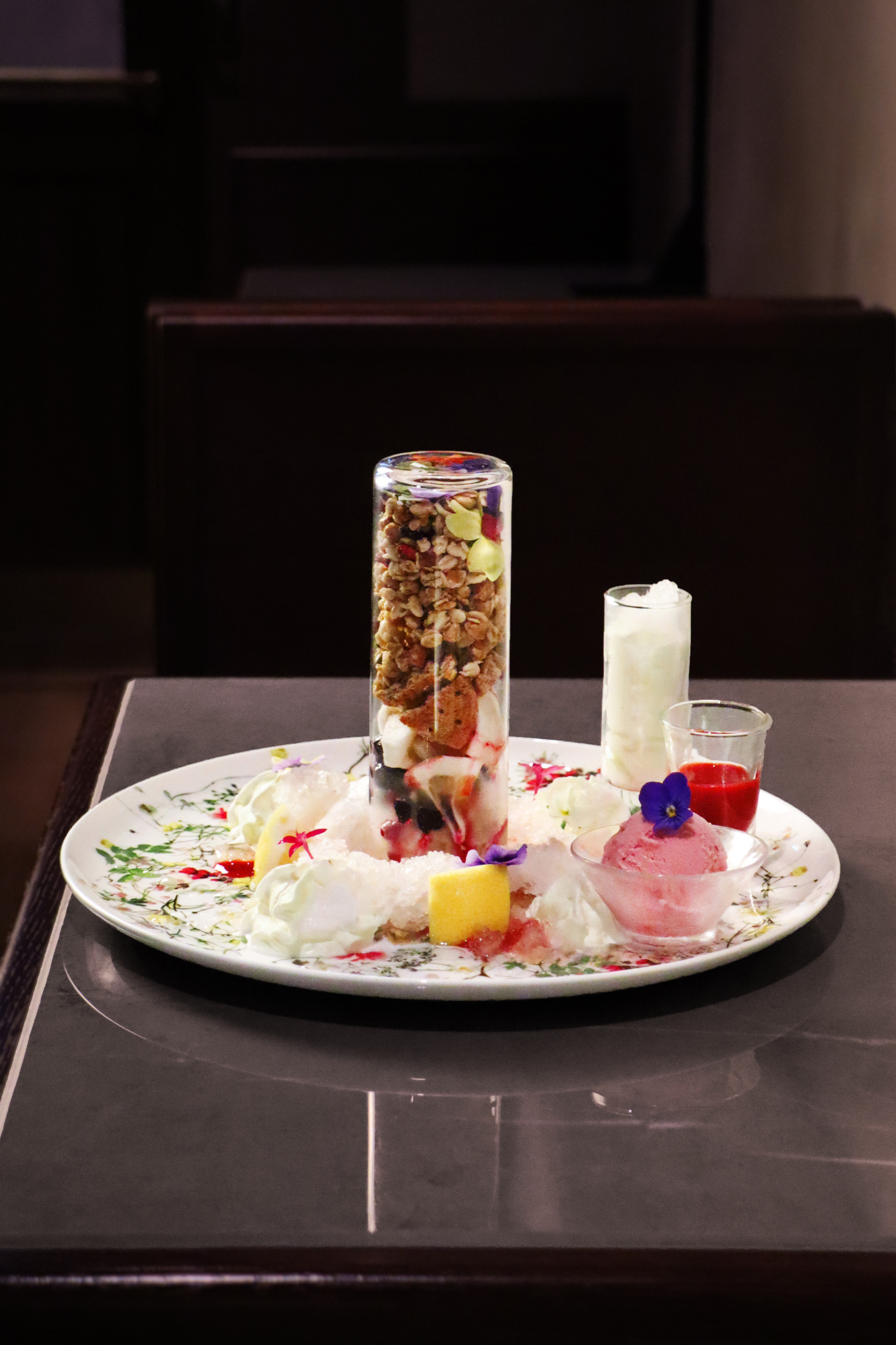 具材は、エディブルフラワーの他にも、柚子のグラニテ、日向夏、オレンジ花水と柑橘スパイスジュレなどが入り、爽やかなの甘さの中に、日向夏の皮のビターさも感じられる、春らしい大人の味わい。
