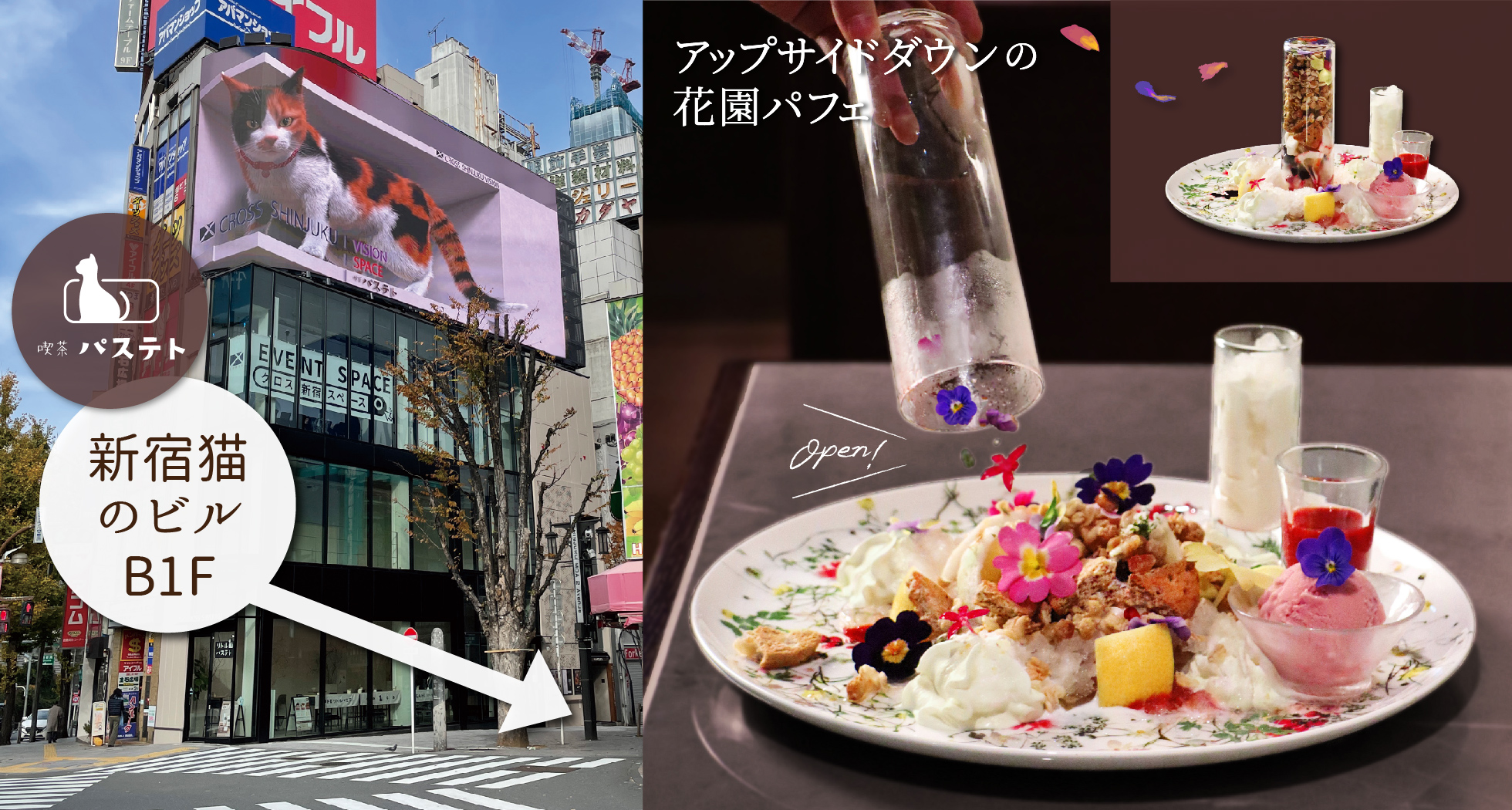 株式会社アズフードシステムズ(本社:東京都中央区、代表取締役:森田威)が運営する、新宿駅東口すぐの喫茶店「喫茶パステト」は、お皿の上に花が咲き乱れる『アップサイドダウンの花園パフェ』を、2023年4月11日(火)より期間限定で発売いたします。お客様の手で逆さまのグラスを持ち上げると、お皿の上に色鮮やかなスイーツが完成。エディブルフラワーを使った、華やかでエキセントリックな、そして甘くビターなパフェです。