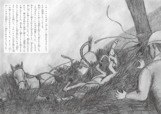 その木に伝わる伝説を、繊細で力強い鉛筆画で表現しました。