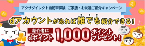 当キャンペーンは、ご紹介いただいた方がアクサダイレクトの自動車保険にご契約いただきましたらご紹介者の方にdポイント1,000ポイントをもれなく差し上げます。dアカウントをお持ちであれば、どなた様でも紹介者となれるドコモスマート保険ナビのキャンペーンです。紹介され、ご契約いただいたたお客さまにもデジタルクーポン(1,300円相当)+さらに抽選で家電が当たります。