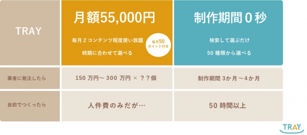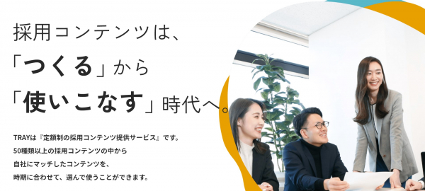 TRAYは「定額制の採用コンテンツ提供サービス」です。50種類以上の採用コンテンツの中から自社にマッチしたコンテンツを、時期に合わせて、選んで使うことができます。