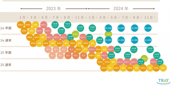 ご契約後は毎月1日に50ptが付与されます。TRAYには50種類以上のコンテンツやサービスがあり、それぞれに最少5pt~最大25ptの消費ポイントが設定されており、ポイントを消費することで企業の採用フェーズに合わせて使いたいコンテンツやサービスをご利用いただけます。夏はインターンシップのワーク、秋には説明会コンテンツ、翌年夏には内定証書のデザインテンプレートや内定者フォローコンテンツなど、時期によって必要なコンテンツが異なる新卒採用にぴったりなサービスの仕組みとなっています。